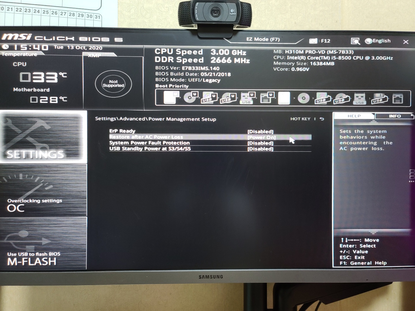 들어가 지실 겁니다 메인보드 옵션에서 Restore After AC Power Loss라는 옵션을 활성화 해줍니다.