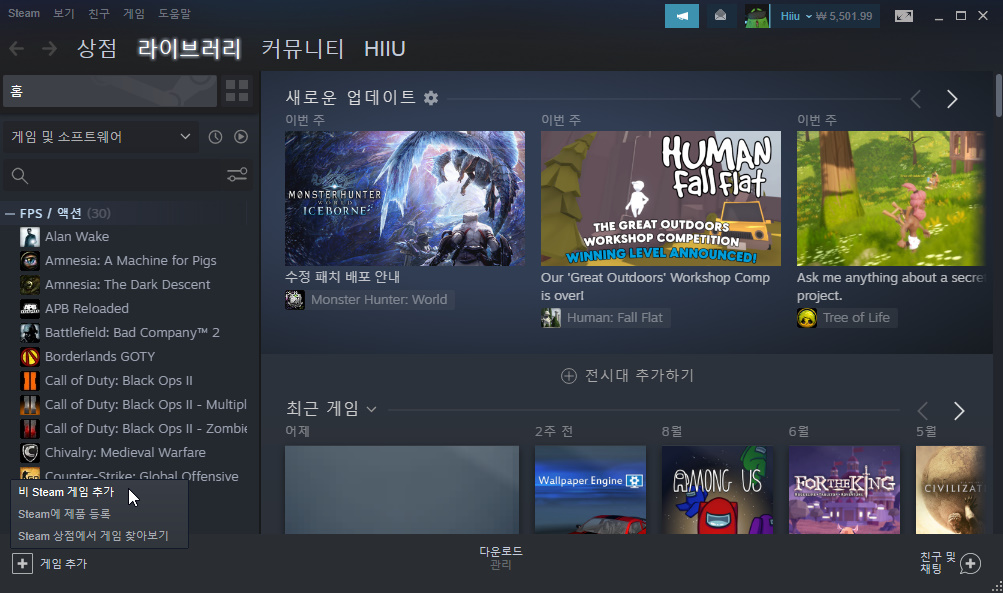 간혹 게임이 안보이는 경우도 있는데 이 경우 스팀 로고를 눌러 다시 라이브러리로 가면 게임이 나옵니다.