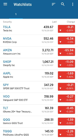 이 앱의 경우 좌측에 있는 Watch List에 관심있는 종목을 추가하여 담으면 현재 가격이 보입니다.