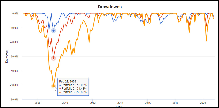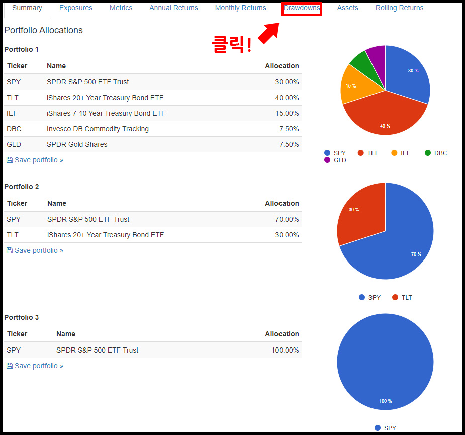 "Drawdowns"를 보면 코로나와 같은 하락장에서 얼만큼 하락하여 내가 현금 비율을