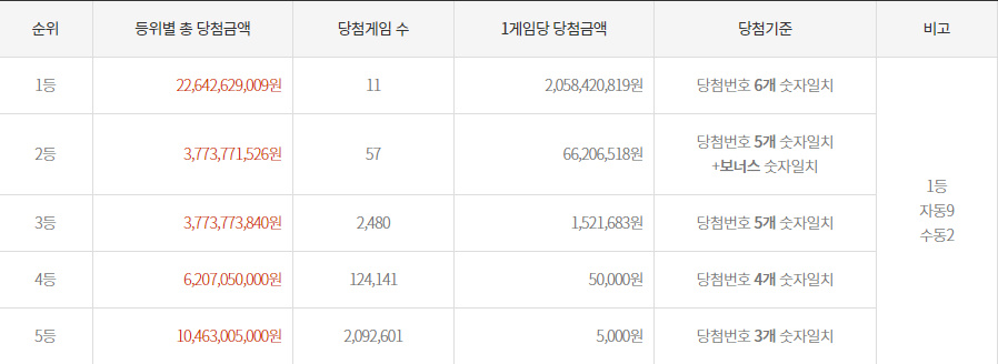 1등 당첨자는 11명으로 20억5842만원씩 지급받으며