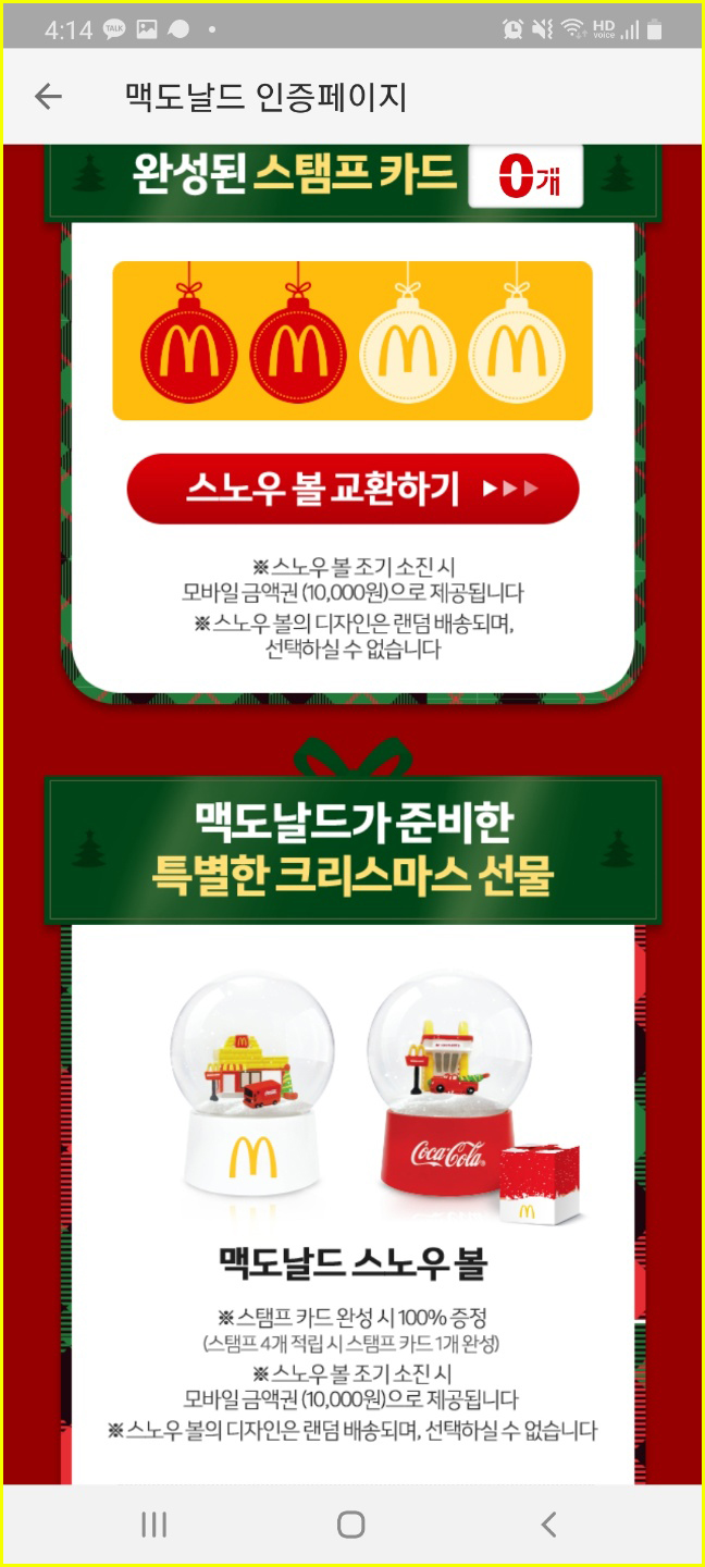 스탬프를 4개 모으면 100% 맥도날드 스노우 볼을 증정해주며, 디자인은 랜덤 배송됩니다.