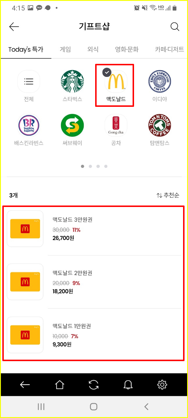 금액이 클 수록 할인율이 높은데 맥도날드 스노우볼을 받기 위해서면 리치포테이토 버거를