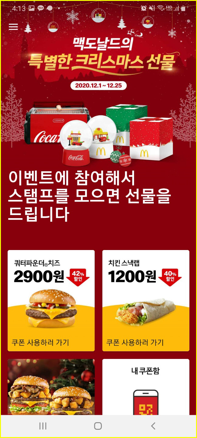 스탬프를 모으면 선물을 준다고 맥도날드 어플 메인 화면에 이렇게 떠있는데요.