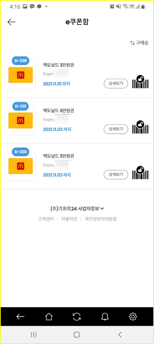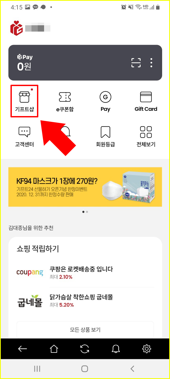 '기프트24'라는 앱을 받아서 로그인 한 다음 위에 있는 기프트샵을 클릭해주세요.