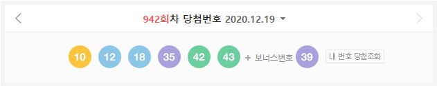 순서대로 10, 12, 18, 35, 42, 43 보너스 번호는 39라고 밝혔습니다.