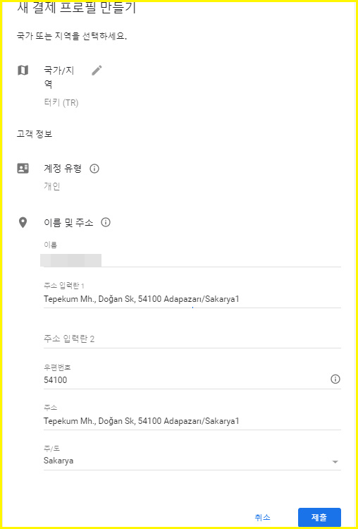 도시는 Sakarya로, 주소2는 따로 입력하지 않아도 되고 제출을 눌러줍시다.