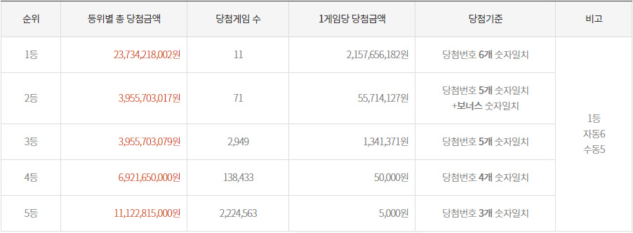 1등 당첨자는 11명으로 23억7342만원씩 지급받으며