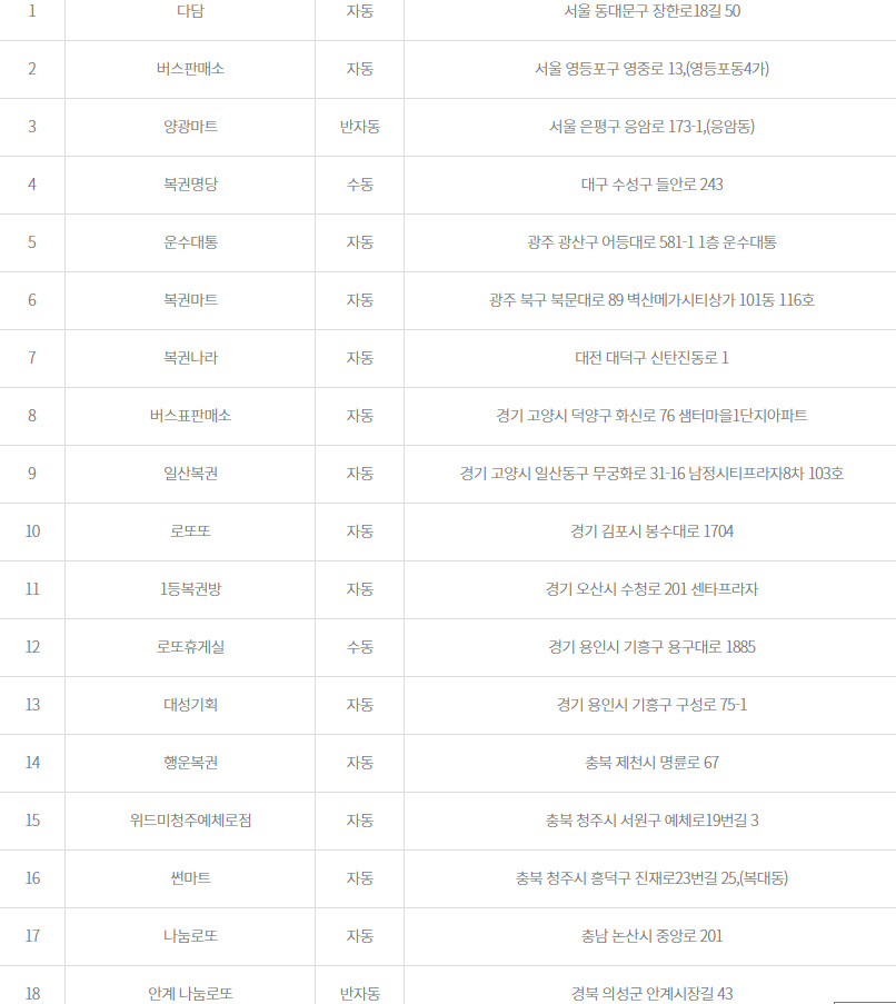 | 18 | 안계 나눔로또 | 반자동 | 경북 의성군 안계시장길 43 |