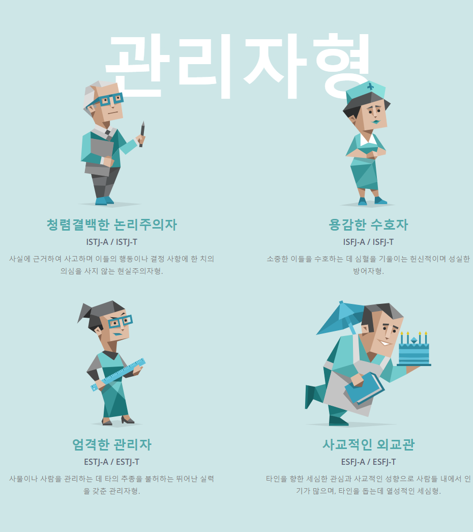 관리자형에는 청렴결백한 논리주의자, 용감한 수호자,