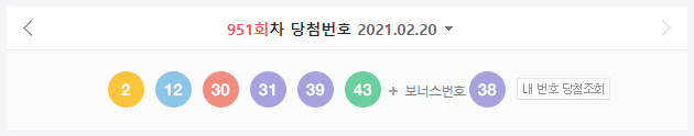 순서대로 2, 12, 30, 31, 39, 43 보너스 번호는 38이라고 밝혔습니다.