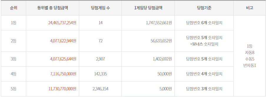 1등 당첨자는 14명으로 17억4755만원씩 지급받으며