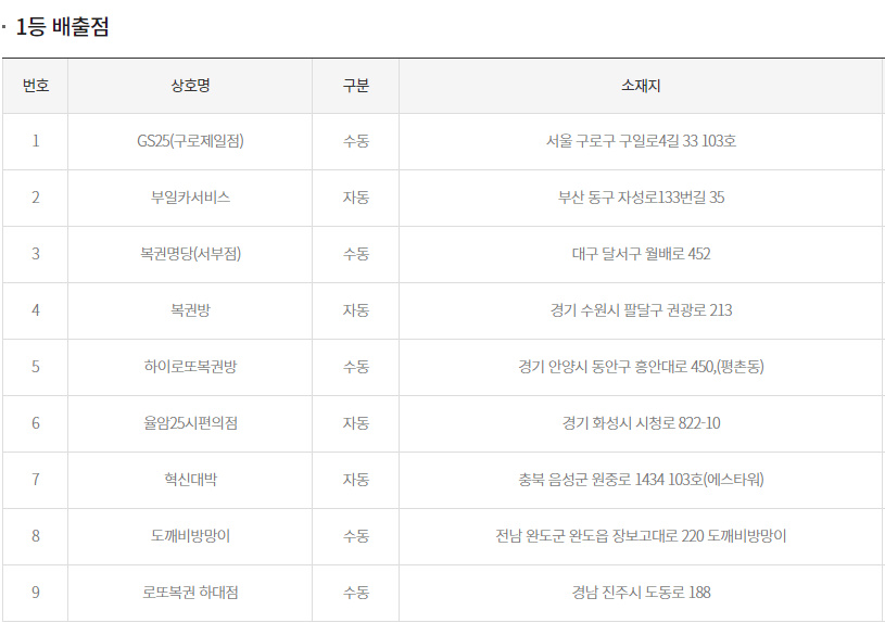 952회 로또 당첨지역은 아래와 같습니다.