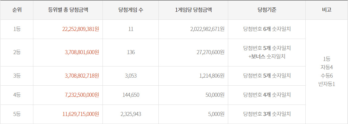 1등 당첨자는 11명으로 20억2298만원씩 지급받으며