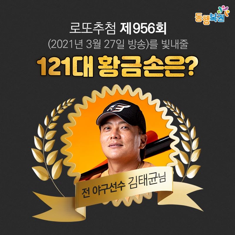 제956회(3월 17일 방송) 로또 당첨추첨 121대 황금손의 주인공은 전 야구선수 김태균님이신데요.