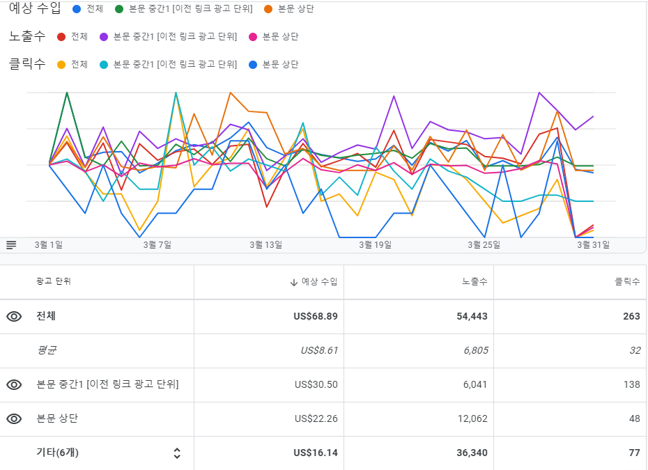 새롭게 발행되는 글이 없으니 노출되는 수가 많이 하락한게 수익이 줄은 원인인 것 같습니다.