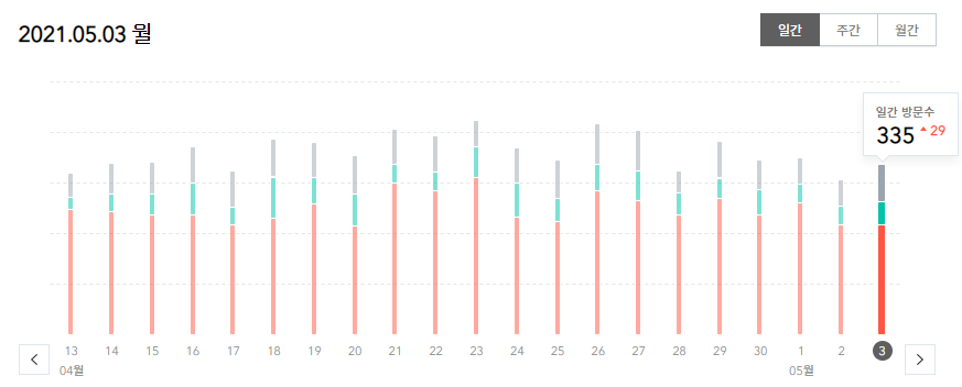 블로그 글을 작성하지 않기 시작한 시점의 평균 방문자수는 일 300~400명 가량이었는데요.