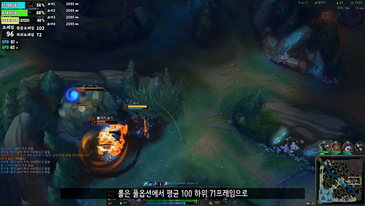 리그 오브 레전드의 평균 프레임은 100 하위 71이며,